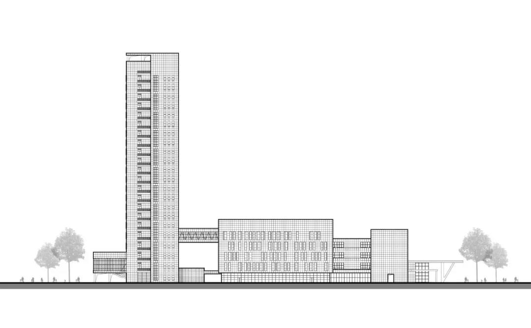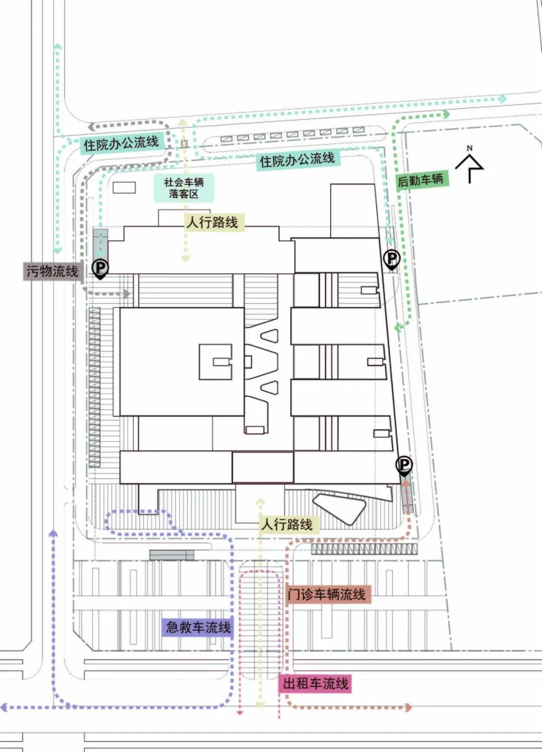 CAPOL負責進行從方案到施工圖全過程的建筑設計總承包工作,創造性地采用“緊湊型三角形結構”:以醫療技術部門為核心,門診部將布置在人流較多的城市主干道,住院部是遠離城市主干道和噪音源的。三角形布局形成的最短會診、急救流線和分層掛號系統,創造出了高效的就醫體驗。